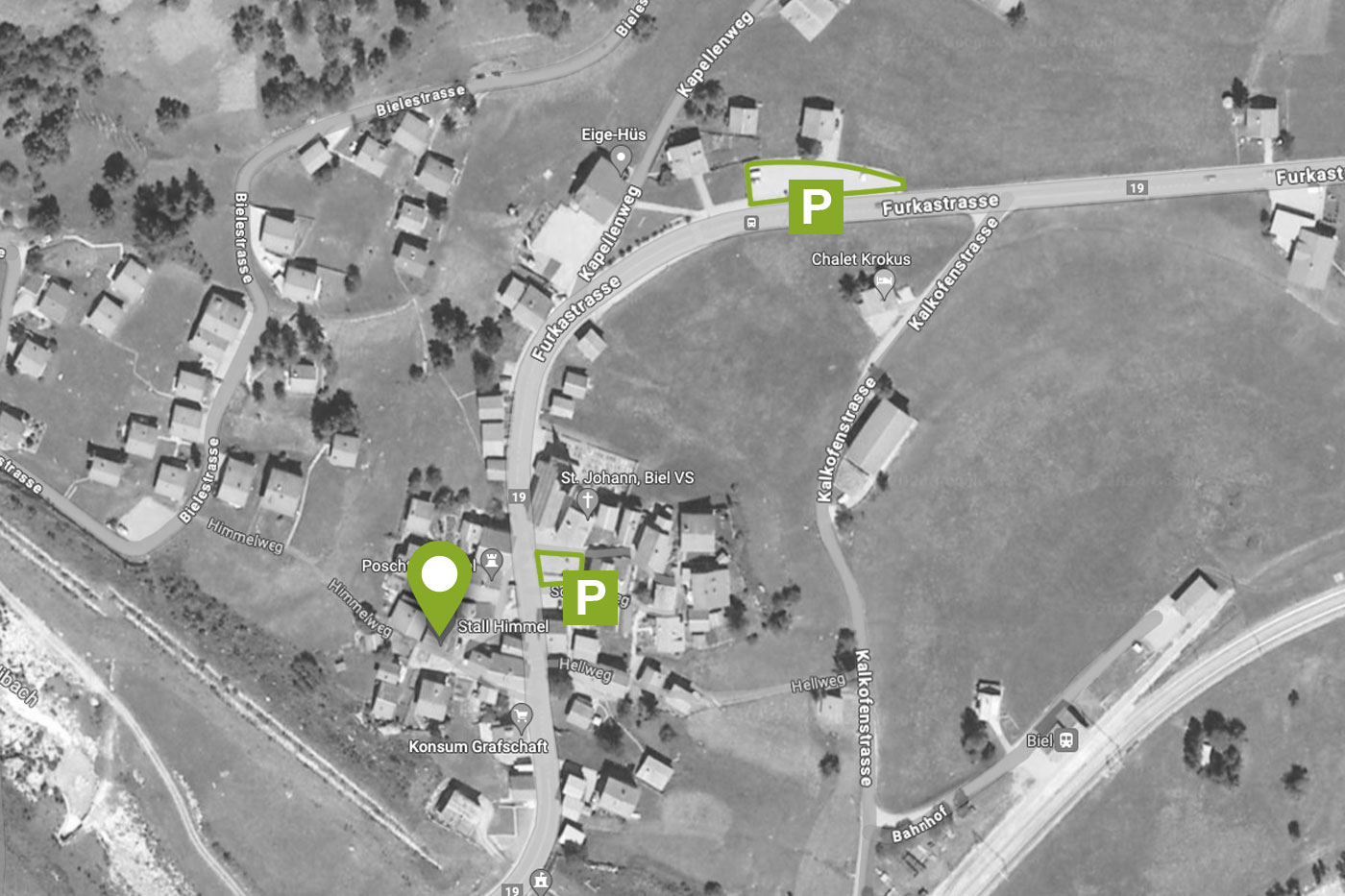 Sie können bis zum Stall fahren (nicht geeignet für grosse Autos oder Vans) und Ihr Gepäck ausladen. Das Auto parkieren Sie danach bitte auf dem öffentlichen, kostenpflichtigen Parkplatz Biel-Eige.