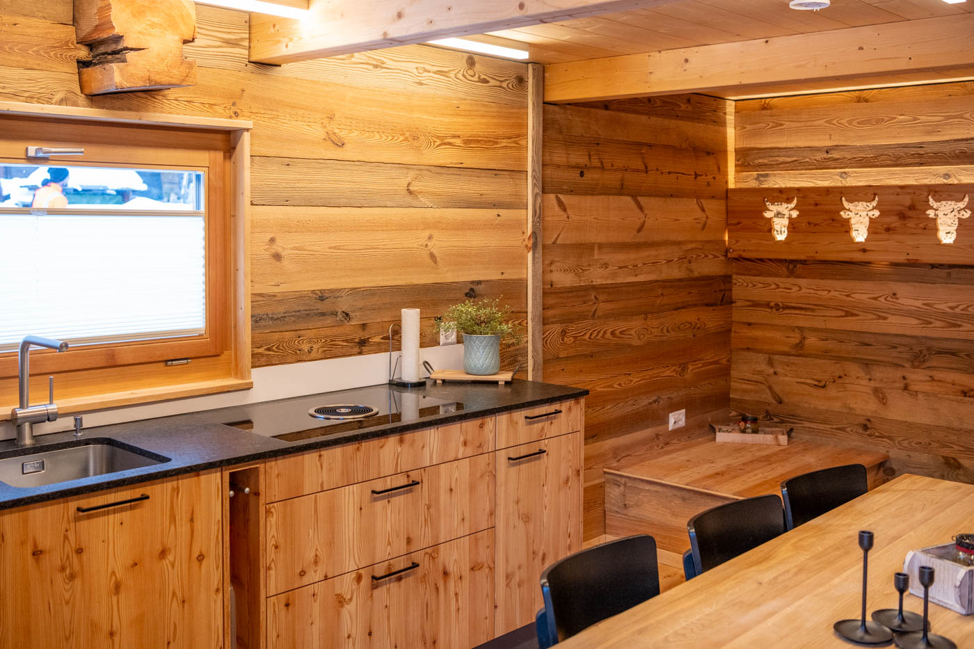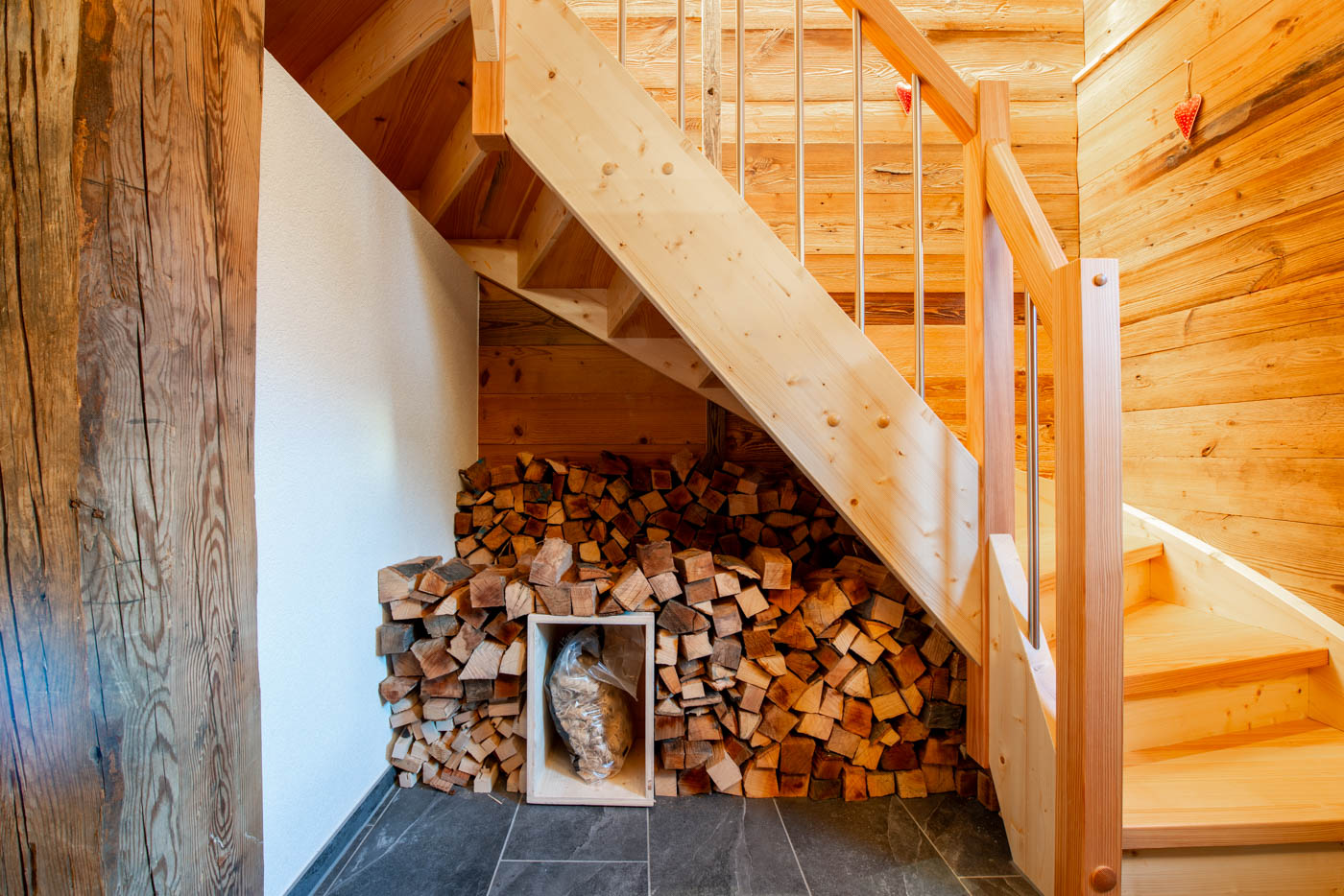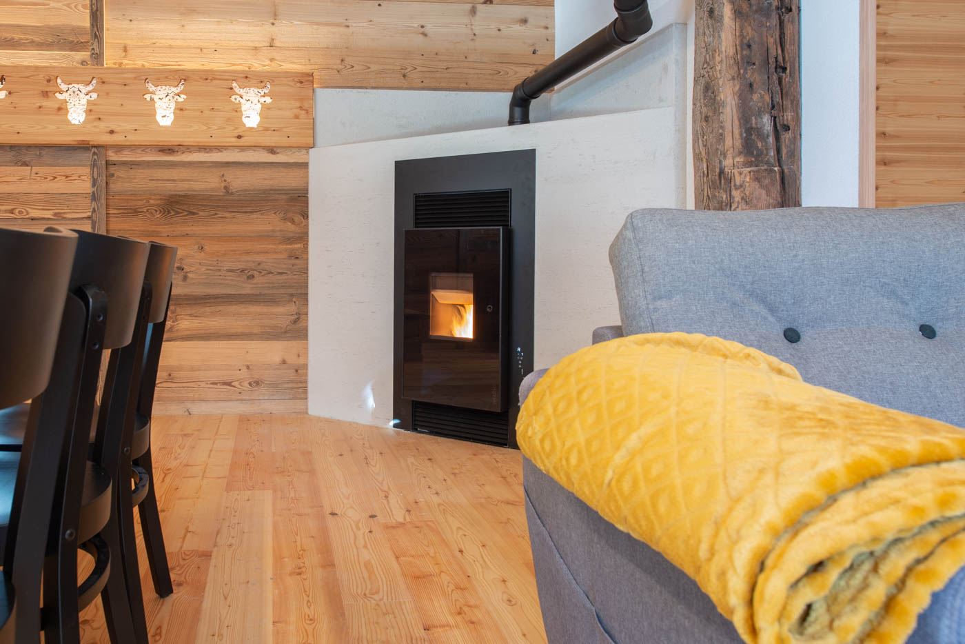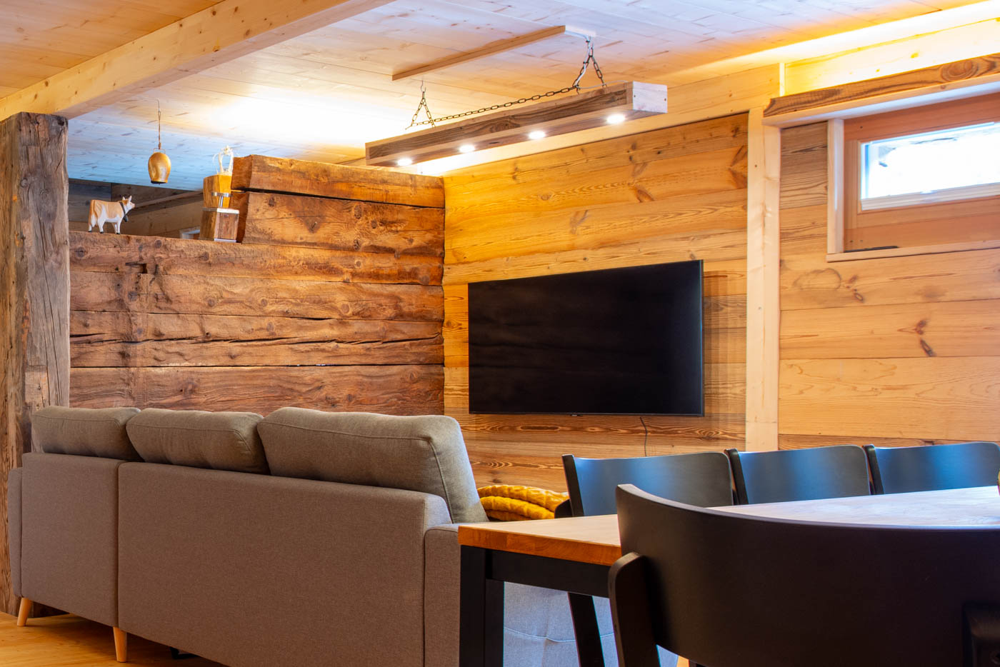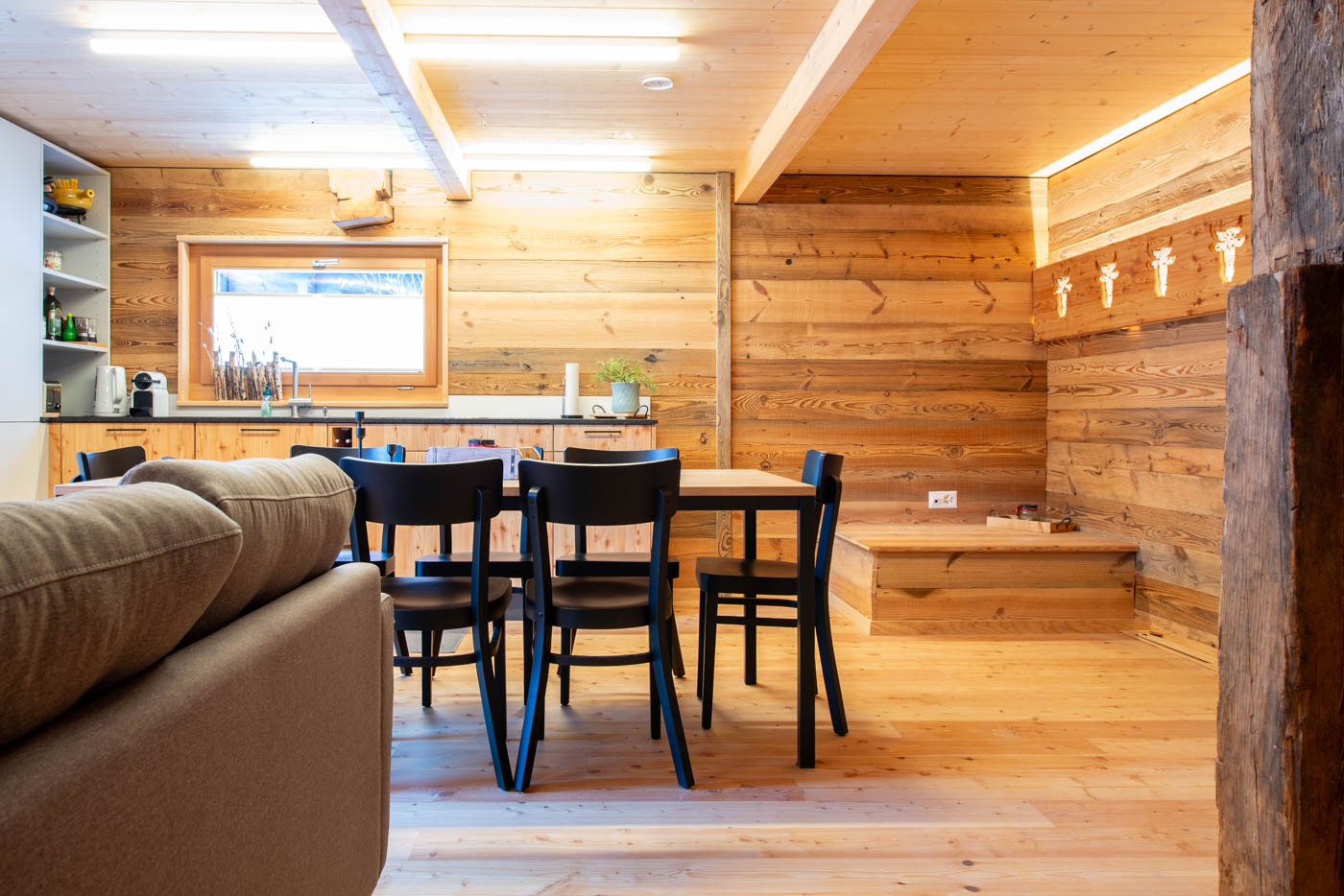 Der Stall bietet Platz für bis zu 8 Personen. Ideal geeignet für Ferien mit der ganzen Familie. Der offene Wohn-/Essbereich wird durch eine moderne, voll ausgestattete Küche abgerundet.