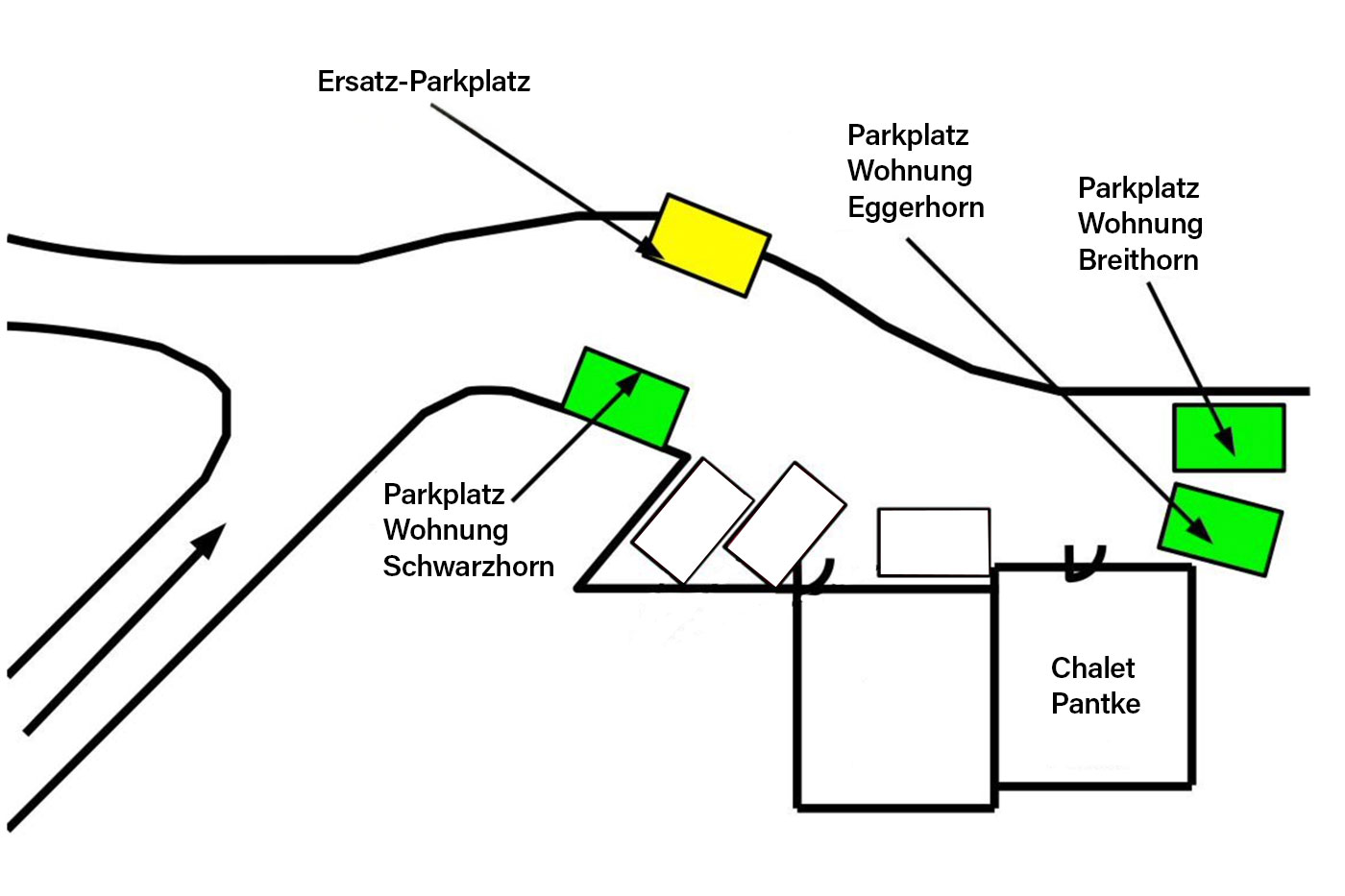 Während Ihres Aufenthaltes steht Ihnen zu jeder Wohnung ein Parkplatz vor dem Chalet bereit. Bitte stellen Sie Ihr Fahrzeug auf den entsprechenden Stellplatz.