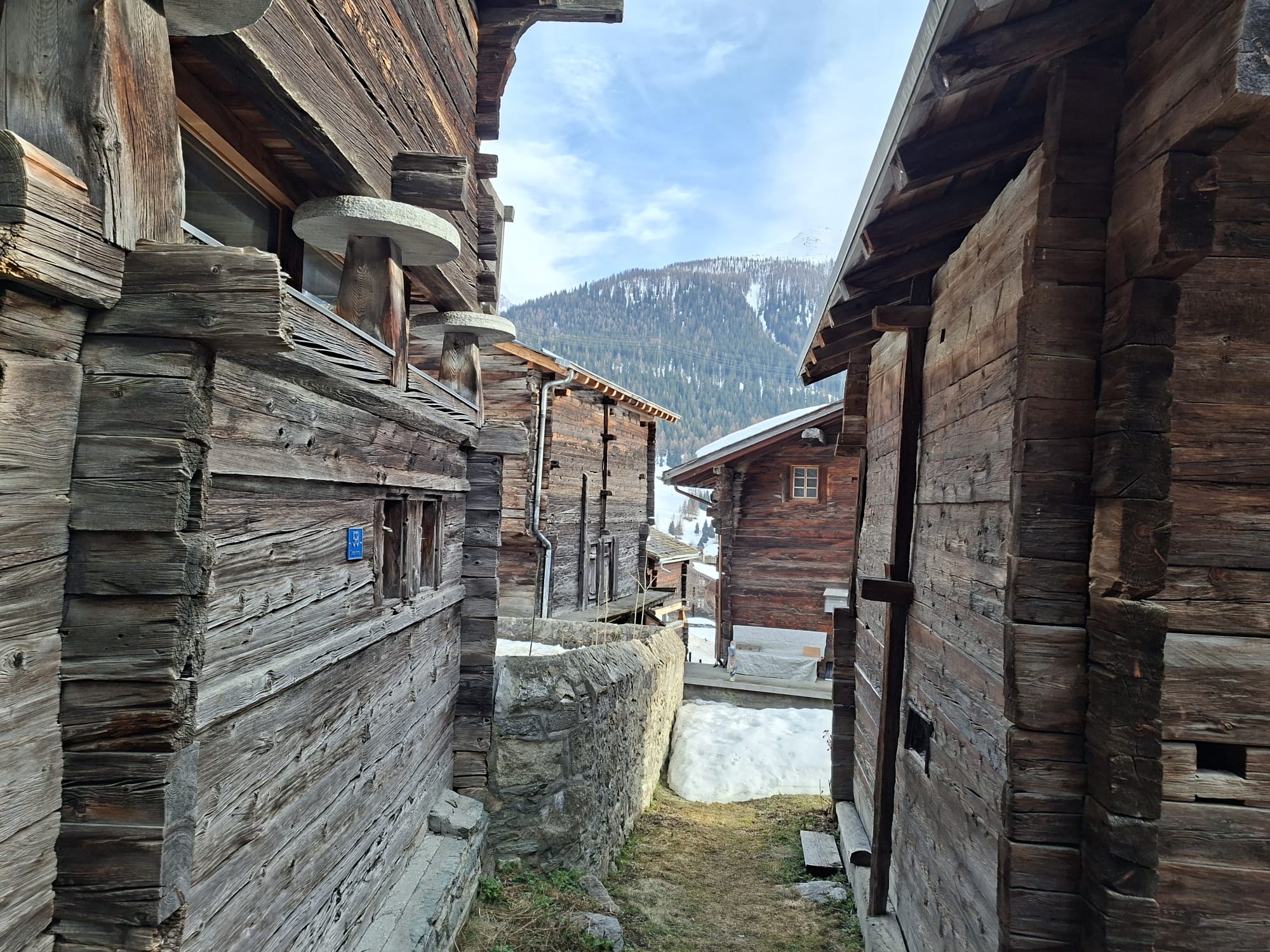 Traditioneller Walliser Stadel nahe Loipe und Wanderwegen